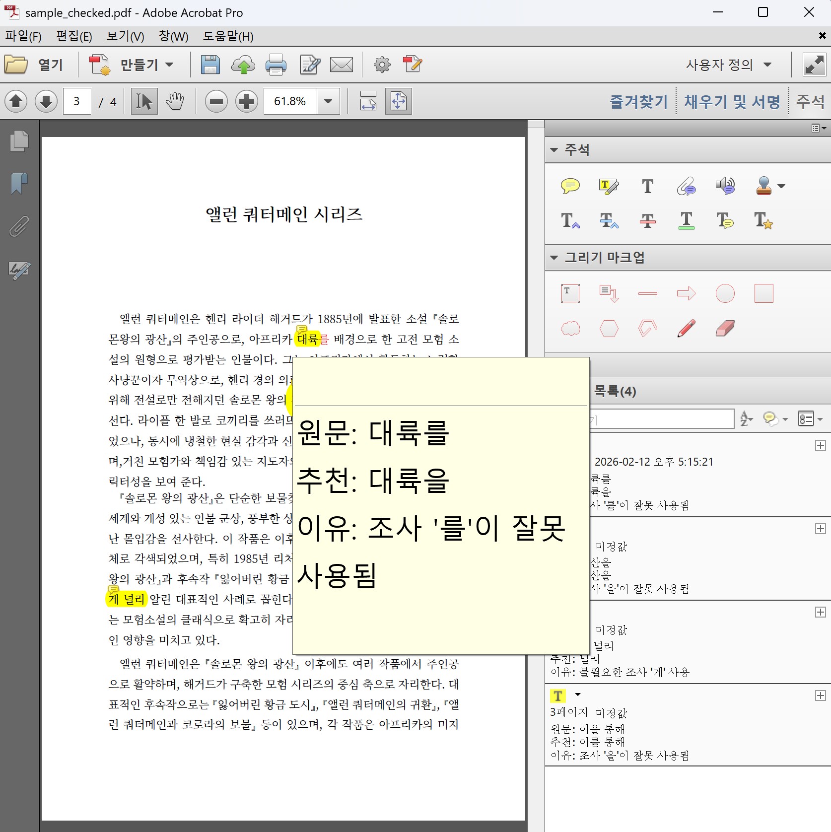 테스트를 위해 3페이지의 PDF에서 1페이지만 골라 임의로 4개의 단어를 맞춤법이 틀리게 하거나,
