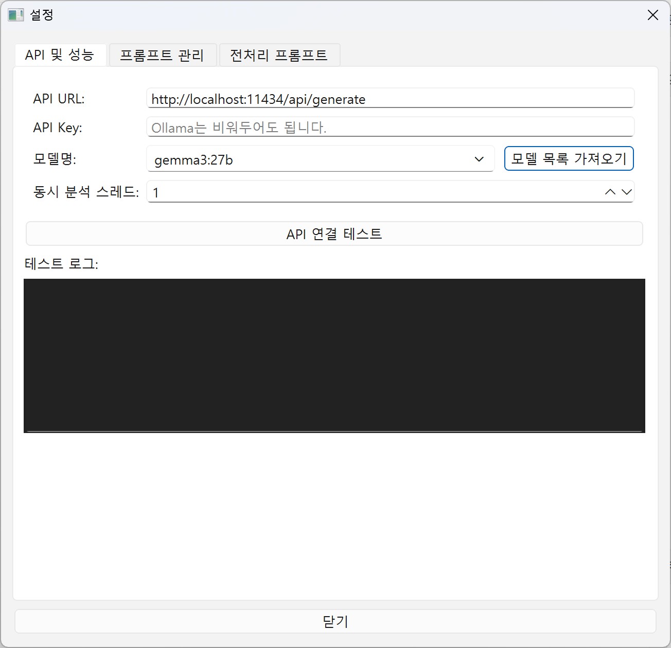 [모델 목록 가져오기]를 눌러보세요. ollama가 설치되어 있고 사용할 모델을 다운로드 했다면 사용 할 수 있는 모델 목록을 볼 수 있습니다. 설치한 모델을 선택하세요. 그리고 API 연결 테스트를 누릅니다.