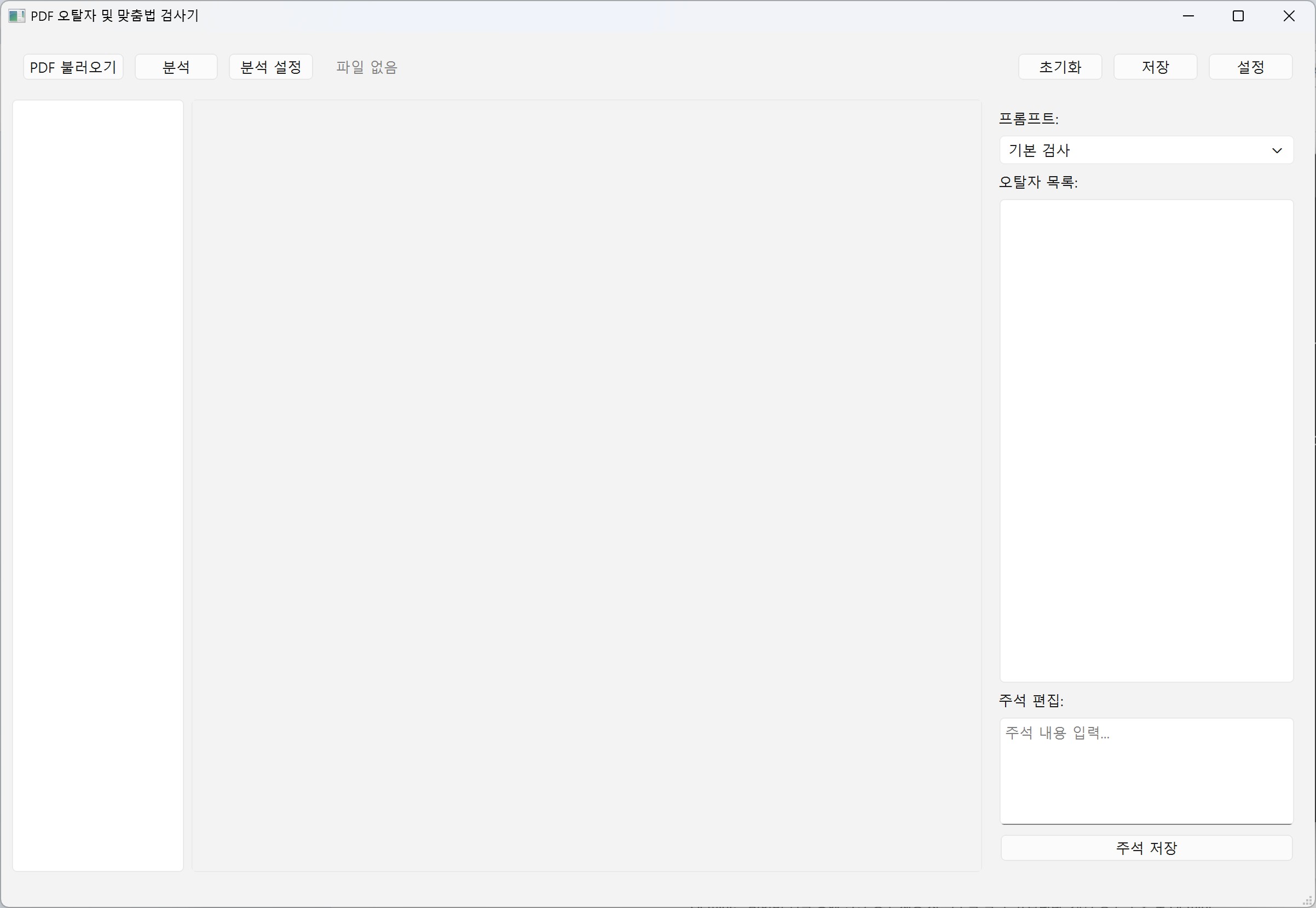 이제 준비가 끝났습니다. PDF를 불러온 후 [분석]을 누르면 맞춤법 검사를 시작합니다.